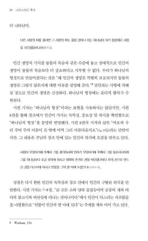 인간 생명의 가치를 동물의 목숨과 같은 수준에 놓고 상대적으로 인간의 생명이 동물의 목숨보다 더 중요하다고 치부할 수 없다. 우리가 하나님의 형상으로 만들어졌다는 것은 “왜 인간의 생명은 특별히 보호되지만 동물의 생명은 그렇지 않은지에 대한 이유를 설명해 준다.”7 살인죄는 사형에 처해질 정도로 인간의 생명은 신성하다. 하나님의 형상에는 윤리적 함의가 수반된다.