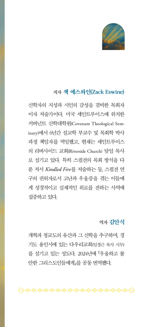 잭 에스와인은 학자의 지성과 시인의 감성을 겸비한 목회자입니다. 찰스 스펄전 목사가 우울증과 벌인 투쟁에서 모아들인 지혜는 신학적으로 매우 깊이가 있는 동시에 목회적으로도 명쾌합니다.