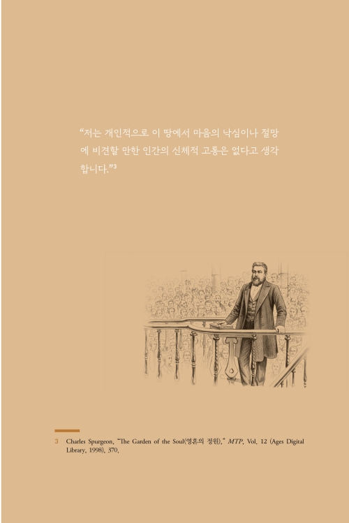 이 책은 스펄전의 경험을 통해 우울증에 대한 신학적 깊이와 목회적 명쾌함을 동시에 제공한다. 그리고 영혼의 어두운 밤을 지나고 있는 모든 이에게, 다시금 숨을 쉴 용기를 주는 소망의 메시지를 선사한다. 독자들은 절망의 강물 속에서 "두려워 말거라! 물속은 깊을지 모르지만, 그 바닥은 안전하단다"라고 말씀하시는 예수님의 따뜻한 위로를 경험하며 소망을 얻을 수 있다. 우울증으로 고통받는 이들은 물론, 이들을 돕고자 하는 가족, 목회자, 상담가 모두에게 실제적인 위로와 지침이 될 것이다.