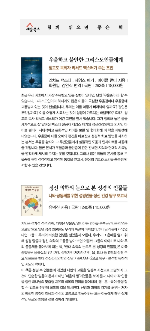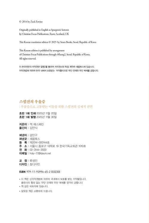 세움북스에서 나온 귀한 이 책이 성도들과 목회자들에게 시대를 넘어 인간 내면에 있는 깊은 슬픔의 실체를 드러내고 하나님의 주권과 그리스도의 사랑에 기초한 명징한 해답을 줄 수 있으리라 확신합니다.