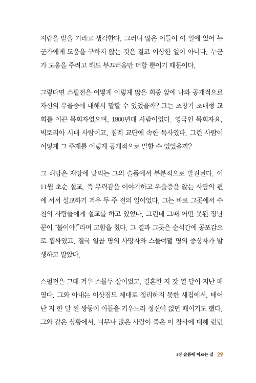 이 책은 스펄전 목사의 경험에 대한 재해석이요 묵상입니다. 저자 에스와인 목사는 스펄전에게서 이 우울증이라는 경험이 본질적으로 인간의 자연스러운 경험이라는 것에 끊임없이 주목합니다. 이 책은 환원주의적 해석이나 마법과 같은 해답 없이 우리가 진일보할 수 있는 좋은 방법이 무엇인지를 보여 줍니다.
