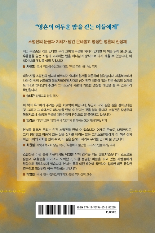 스펄전은 이런 슬픔 가운데서도 탁월한 유머 감각을 지닌 설교자였습니다. 스스로도 슬픔과 우울증을 이기려고 노력했고, 또한 동일한 아픔을 겪고 있는 사람들에게 말씀으로 위로하고자 했습니다. 그것으로 기뻐했습니다. 본서는 특히 이런 측면에 착안하여 정리한 매우 유익한 연구라고 확신하며 적극 추천하는 바입니다.
