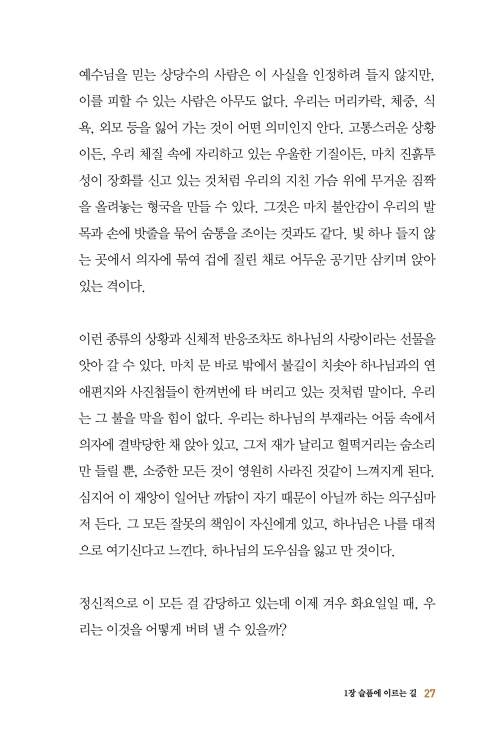 저는 개인적으로 이 땅에서 마음의 낙심이나 절망에 비견할 만한 인간의 신체적 고통은 없다고 생각합니다.