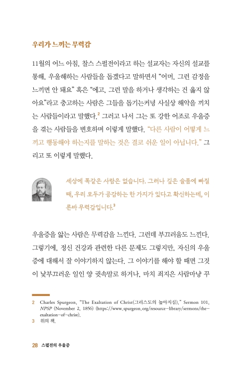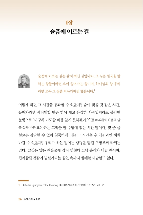 스펄전 목사가 가진 우울증에 대한 지식과 자신의 지식을 함께 엮어 낸 에스와인 목사는 지쳐 있는 이들의 정직한 싸움에 필요한 언어를 제공합니다. 참으로 훌륭하기 이를 데 없는 책입니다.