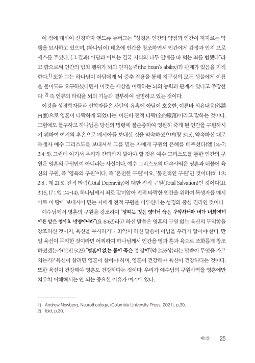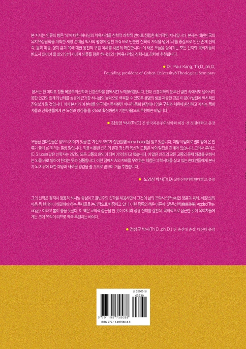 본서는 한 마디로 정통 복음주의신학과 신경신학을 접목시킨 노작(勞作)입니다. 현대 신경과학의 눈부신 발전 속에서도 넘어서지 못한 인간의 한계와 난제를 성경에 근거한 하나님의 능력으로 극복할 수 있도록 생명의 빛을 제공한 것은 이 분야 발전에 역사적인 진일보가 될 것입니다. 이에 본서가 이 분야를 연구하는 독자뿐만 아니라 목회 현장에서 영혼 구원과 치유에 헌신하고 계시는 목회자들과 신학생들에게 큰 도전과 영감을 줄 것으로 확신하면서 기쁜 마음으로 추천하는 바입니다.