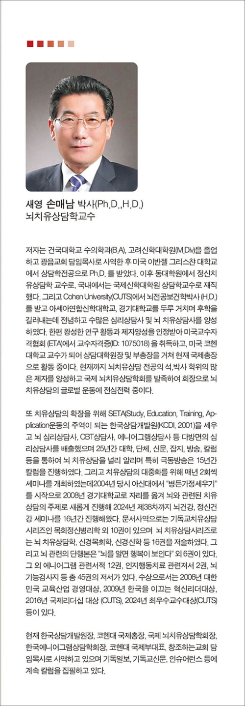 본 저서는 인류의 병든 ‘뇌’에 대한 하나님의 치유사역을 신학적 과학적 언어로 정립한 획기적인 저서입니다. 본서는 대한민국의 뇌치유상담학을 개척한 새영 손매남 박사의 평생에 걸친 저작으로 단순한 신학적 저작을 넘어 ‘뇌’를 중심으로 인간 존재 전체 즉, 몸과 마음, 영과 혼과 육에 대한 통전적 구원 이해를 새롭게 확립합니다. 이 책은 오늘을 살아가는 모든 신자와 목회자들이 반드시 읽어야 할 삶의 양식서이며 인류를 향한 하나님의 뇌치유사역의 신학서로 강력히 추천합니다.