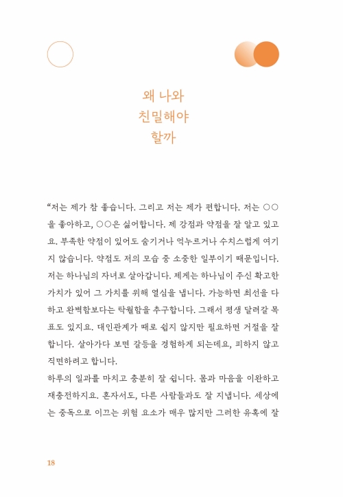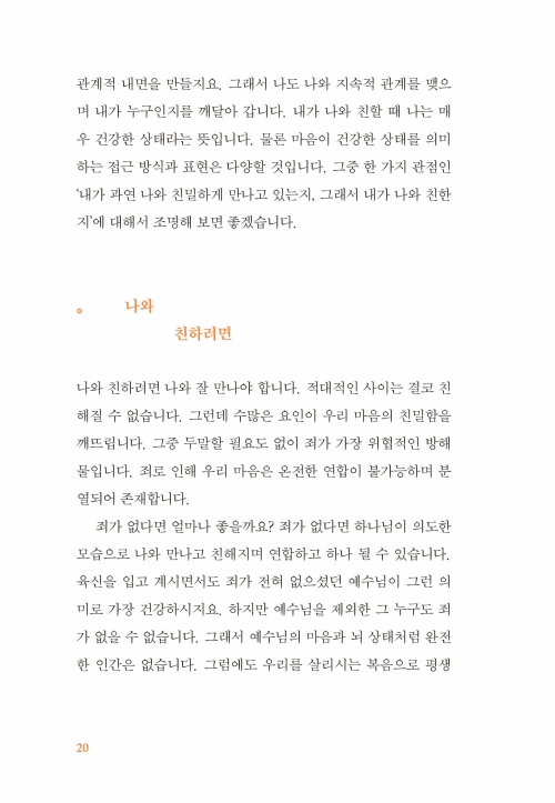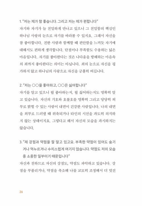 나와 친밀하지 않은 극단적 예를 12가지 정도로 먼저 정리해 보면 다음과 같습니다. 1. “저는 제가 누구인지 잘 모르겠습니다. 뭘 좋아하는지도 모르겠고요” 내가 나와 친하지 않으니 당연히 내가 누구인지 모릅니다. 진리를 기반으로 내가 나를 인식하지 않으면 거짓을 기반으로 인식할 수밖에 없습니다. 그래서 내가 하나님이 만드신 걸작이 아니라 무능하고 부족하고 잘못된 존재라고 오해합니다. 내가 날 모르니 내가 좋아하는 것이 뭔지 알 기회가 없었던 것이지요. 내가 좋아하는 것에 집중하기보다 두려움에 휩싸여 타인이나 세상의 눈치를 봅니다.