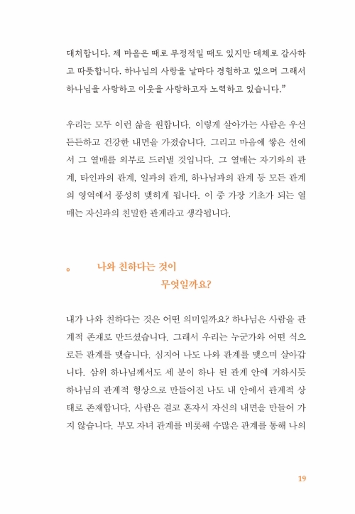 하나님을 아는 것만큼 중요한 것은 없습니다. 사도 바울도 그리스도를 아는 지식이 가장 고상하다고 고백합니다. 감사한 것은 하나님을 알아 갈수록 나를 알아 가게 된다는 사실입니다. … 하나님을 더 알아 가기 위해 평생을 드리듯, 하나님이 만드신 나를 알아 가는 것 역시 평생 애써야 하는 일입니다.