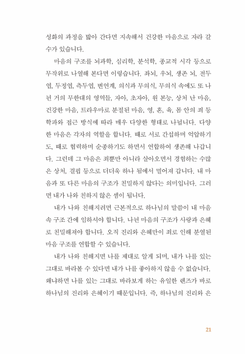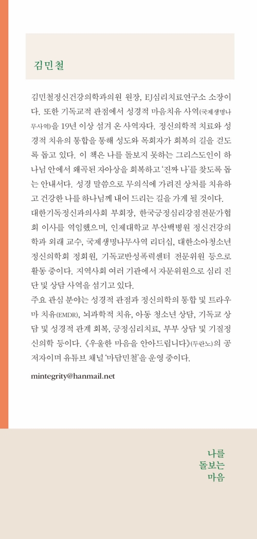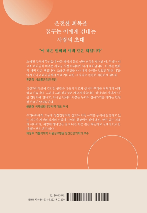 정신과의사로서 김민철 원장은 마음의 구조와 상처의 뿌리를 정확하게 이해하고 있습니다. 그러나 그의 전문성은 차갑지 않습니다. 하나님의 자녀가 ‘나’를 건강하게 만나고, 하나님 안에서 기쁨을 누리며 살아가기를 바라는 간절한 마음이 담겼습니다.