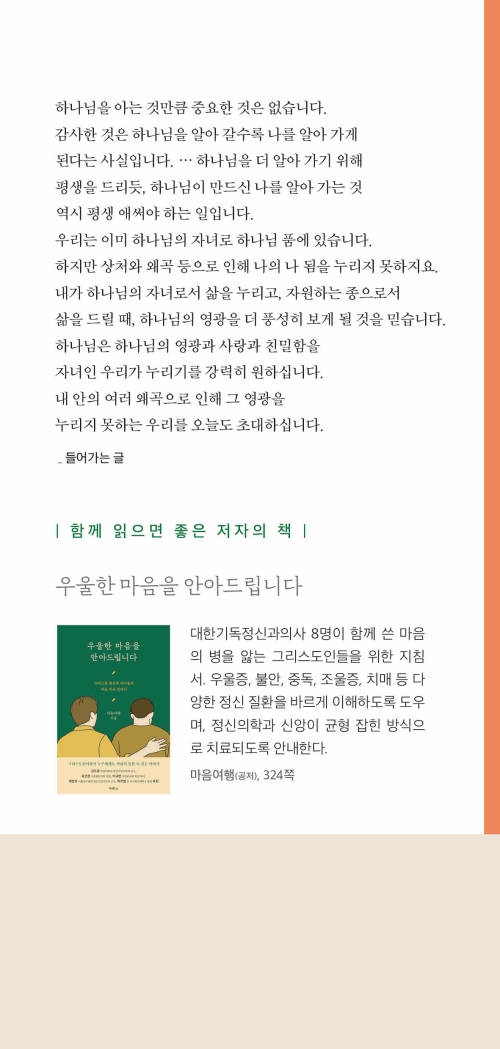우리나라에서 드물게 정신건강의학 진료와 기독 사역을 동시에 감당하고 있는 저자가 자신의 상처와 신앙과 사역의 현장에서 길어 올린, 살아 있는 치유의 이야기다. 이렇게 하나님을 알고 나를 아는 길을 따뜻하고 실제적으로 안내하는 책은 흔치 않다.