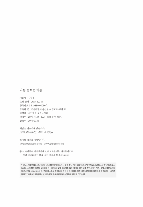 오래된 상처와 두려움이 만든 해석의 틀로 인한 죄성을 벗어날 때, 우리는 비로소 하나님이 비추는 새로운 시선 아래에서 다시 태어납니다. 이 책은 변화의 새벽 같은 책입니다. 조용한 문장들 사이에서 우리는 잊었던 ‘참된 나’를 다시 만나고 하나님께서 오래 기다리신 그 자리로 천천히 귀환하게 됩니다.