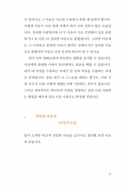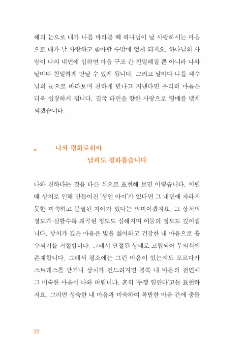 자아 중심의 자기계발서와는 방향성이 다르다. 저자가 강조하는 전 과정의 목표는 오직 하나님 앞에 거하기 위함이며, 이것이 회복의 완성임을 강조한다. 나다워져야 하는 이유가 행복한 나를 누림에도 있지만, 건강한 나를 하나님께 산 제물로 내어 드리기 위함에 있다. 하나님의 사랑이 충만한 만큼 그 안에서 참된 자유를 누릴 수 있다고 강조하는 이 책을 통해 예수님처럼 말씀이 온전히 나를 주장하는 삶을 살게 될 것이며, 하나님께서 의도한 나로 한층 성장할 것이다.