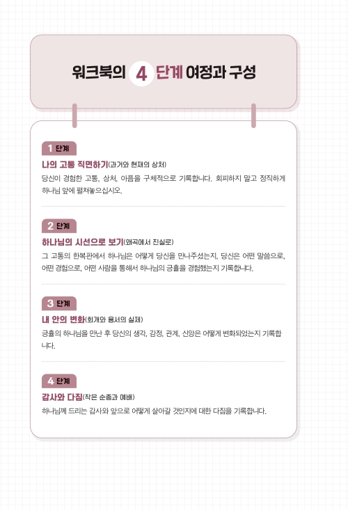 이 책의 진가는 챕터마다 마련된 묵상과 토론 질문, 그리고 부록으로 실린 실천 워크북에서 더욱 분명하게 드러난다. 이 과정은 단순한 독후감이나 연습이 아니라 오랫동안 회피했거나 혼자 짊어졌던 고통을 하나님의 긍휼하신 품 안에서 직면하고 해결하는 치유와 회복의 마지막 단계로서, 혼자만의 묵상과 정리는 물론, 소그룹의 토론 및 실천용으로도 매우 유용하다.