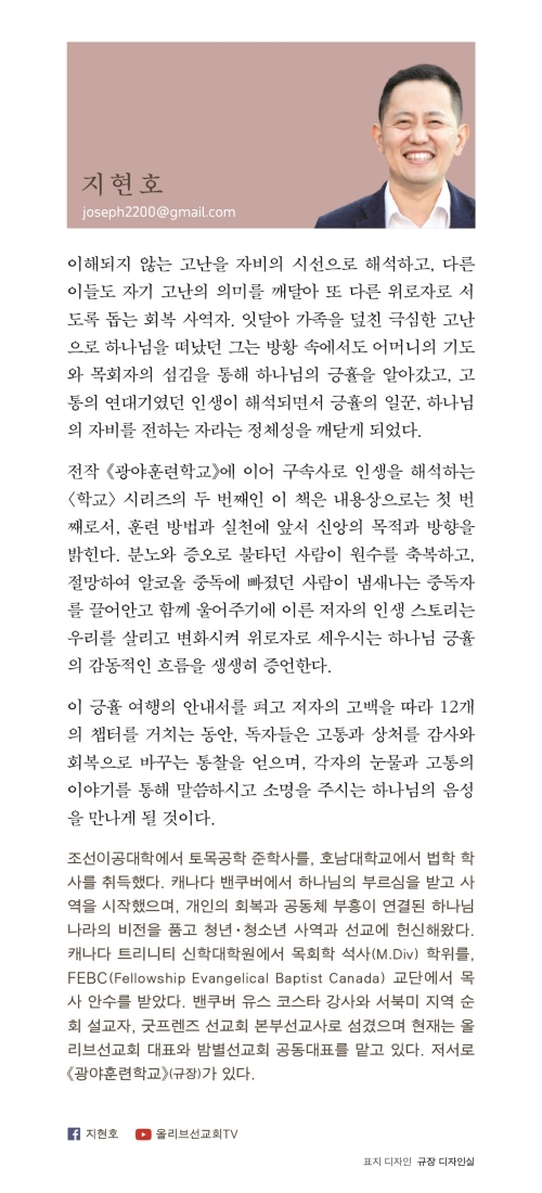 고난을 구속사로 해석하는 저자의 <학교> 시리즈에서 《광야훈련학교》에 이은 두 번째 권이자 내용상 첫 번째에 해당하는 이 책은 신앙의 실천이나 훈련 이전에 하나님을 향한 믿음의 방향과 존재의 목적을 분명하게 세워준다. 저자가 성경의 견고한 토대 위에서 통찰하며 솔직히 풀어내는 고난의 간증은 그만의 특별한 사연을 넘어, 누구나 겪는 상처와 방황 속에서도 하나님의 긍휼과 역사는 멈추지 않음을 생생히 증언한다.