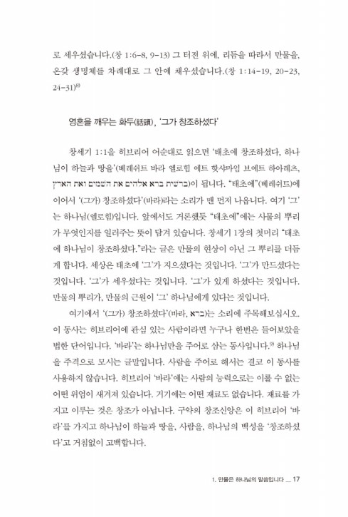 저자는 그렇게 본문을 읽고 깨달은 바를 마이스터 에크하르트나 『도덕경』을 비롯한 동양 고전들의 가르침과 마주하게 하여 그 깨달음의 폭을 넓히고, 아울러 현대 시인들의 작품을 활용하여 창조신앙의 의미를 가슴 깊이 새길 수 있도록 하였다.