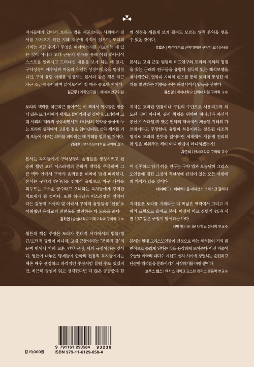 토라의 맥락을 차근차근 풀어주는 이 책에서 독자들은 한층 더 넓은 토라 이해의 세계로 들어가게 될 것이다. 그리하여 고대 사회의 맥락과 공유하면서도 하나님의 언약을 중심에 두는 토라의 성격에서 고유한 점을 읽어낸다면, 신약 세계를 거쳐 오늘에 이르는 의미를 파악하는 데 지혜를 얻게 될 것이다.