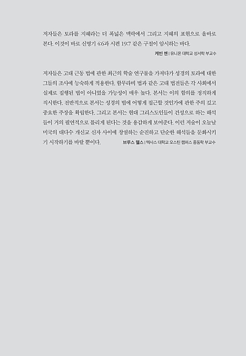 본서는 토라가 고대 근동의 맥락에서 율법이나 법률로 기능한 것이 아니라 하나님과 이스라엘 백성 간의 언약 관계 안에서 합당한 질서를 유지하기 위한 가르침 또는 교훈 모음집으로 기능했다고 주장한다. 우리 시대에 토라의 적절한 위치와 기능을 올바로 이해하기 원하는 사람이라면 반드시 읽어야 할 책이다.