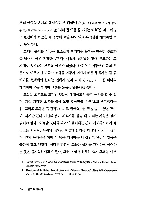 욥은 자신의 이야기가 책으로 남기를 원했고 모든 해석자는 그 책의 결정판을 만들려 노력했다. 그러나 욥기는 결정적 해석이라는 울타리에 갇히기를 거부한다. 정통 교리를 따르는 해석자는 욥기와 마주하고 어려움을 겪었다. 정통 교리는 욥의 발언을 받아들이기 힘들기 때문이다. 오히려 정전으로 인정받는 다른 성서 문헌과 가장 잘 들어맞는 욥기의 구절들은 욥의 친구들이 욥에게 건넨 말들이다. 그러나 욥기에서 하느님은 이 경건한 친구들을 질타한다. 하지만 하느님이 욥을 괴롭히는 것처럼 보인다는 이유로 욥기를 현대적으로 해석하는 것 또한 적절하지는 않다. ---p.11