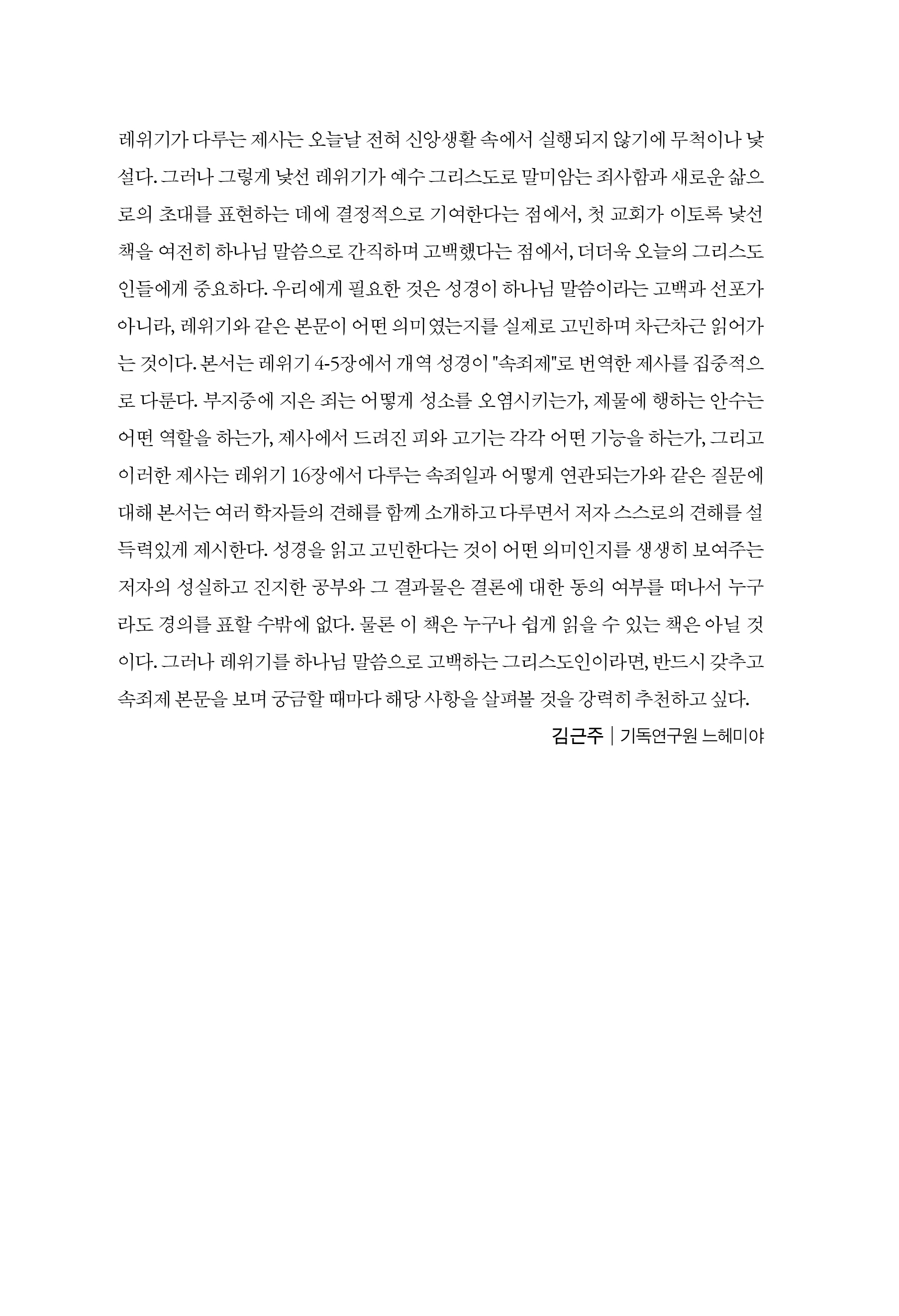 레위기가 다루는 제사는 오늘날 전혀 신앙생활 속에서 실행되지 않기에 무척이나 낯설다. 그러나 그렇게 낯선 레위기가 예수 그리스도로 말미암는 죄사함과 새로운 삶으로의 초대를 표현하는 데에 결정적으로 기여한다는 점에서, 첫 교회가 이토록 낯선 책을 여전히 하나님 말씀으로 간직하며 고백했다는 점에서, 더더욱 오늘의 그리스도인들에게 중요하다. 우리에게 필요한 것은 성경이 하나님 말씀이라는 고백과 선포가 아니라, 레위기와 같은 본문이 어떤 의미였는지를 실제로 고민하며 차근차근 읽어가는 것이다. 본서는 레위기 4-5장에서 개역 성경이 "속죄제"로 번역한 제사를 집중적으로 다룬다. 부지중에 지은 죄는 어떻게 성소를 오염시키는가, 제물에 행하는 안수는 어떤 역할을 하는가, 제사에서 드려진 피와 고기는 각각 어떤 기능을 하는가, 그리고 이러한 제사는 레위기 16장에서 다루는 속죄일과 어떻게 연관되는가와 같은 질문에 대해 본서는 여러 학자들의 견해를 함께 소개하고 다루면서 저자 스스로의 견해를 설득력있게 제시한다.
