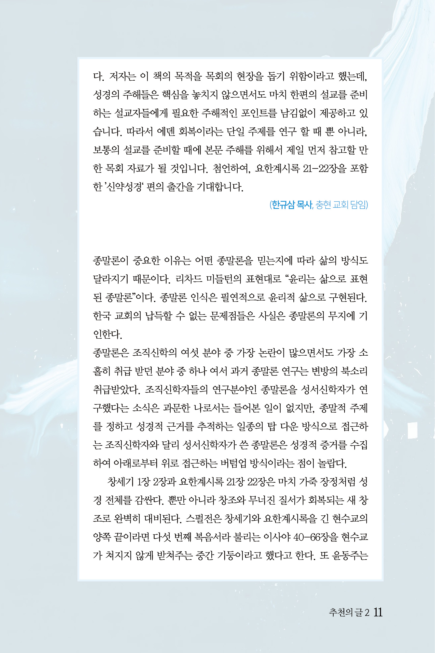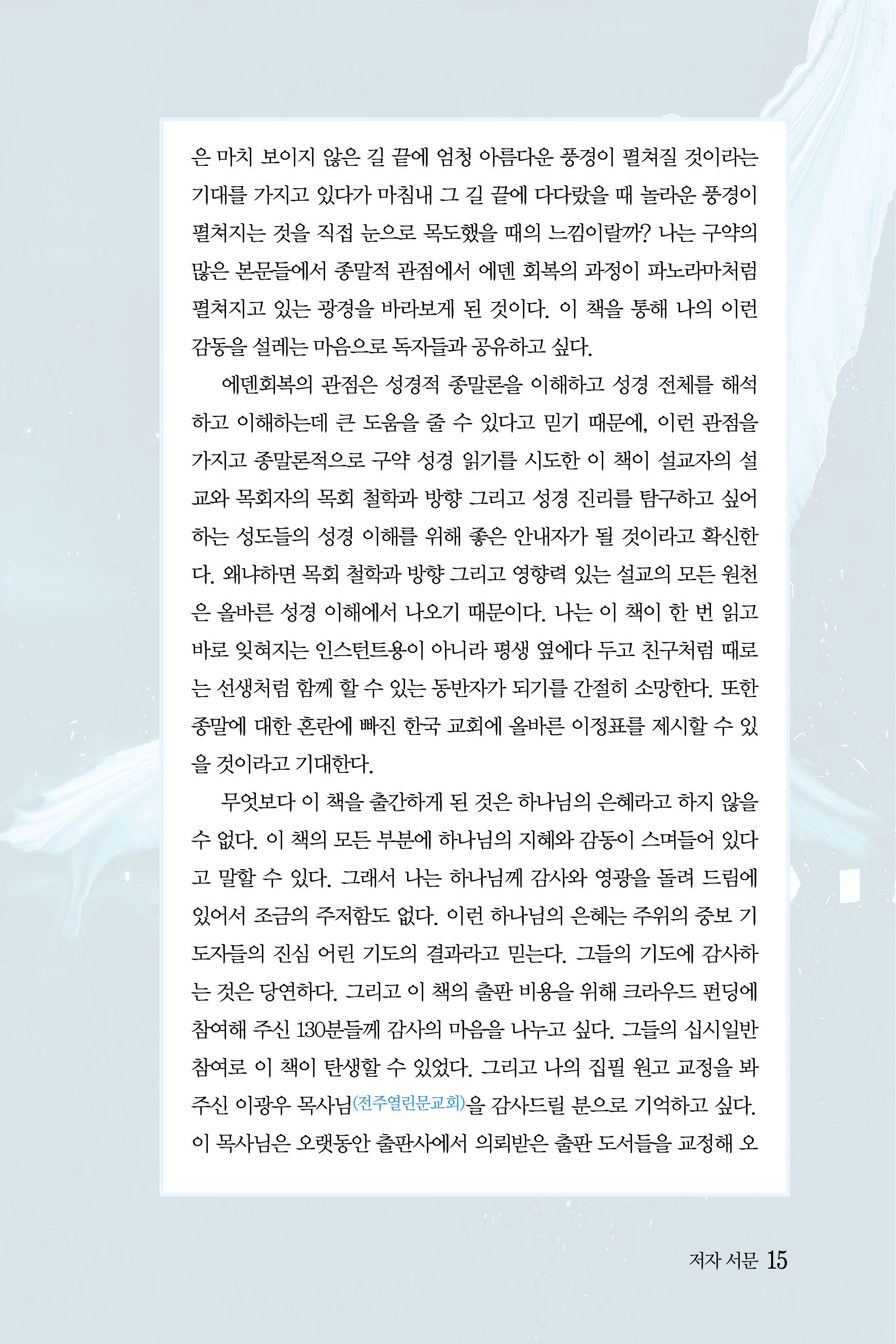 이 책은 에덴 회복이라는 주제로 구약의 종말론 본문을 주해하며 체계화하여 언약과 율법 등 다양한 신학의 주제까지 녹여낸 획기적인 융복합 신학 작품이다. 이 역작은 성경적 종말론을 진지하게 연구하는 모든 분들에게 이 책의 관점 및 논지에 대해 취할 수 있는 찬성 반대의 입장을 막론하고 천천히 음미하며 노 저어 건너가야 할 큰 호수와 같은 필독서가 될 것이다.