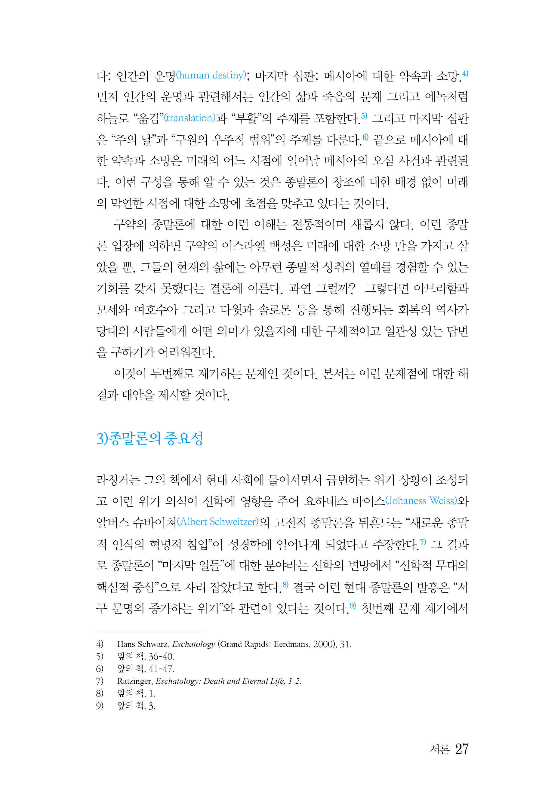 셋째로, 에덴 회복의 주제를 담고 있는 사건과 인물 그리고 제도들이 많기 때문에 그 모든 것을 다루려면 많은 지면이 필요하다. 그러므로 이 책은 선별된 본문과 주제들을 중심으로 논의를 진행한다. 또한 구약에서 에덴 회복 이라는 주제를 다루게 될 때 그 주제는 필연적으로 종말적 개념을 내포하고 있기 때문에 모든 장의 제목에 ‘종말’이란 단어를 사용한다.