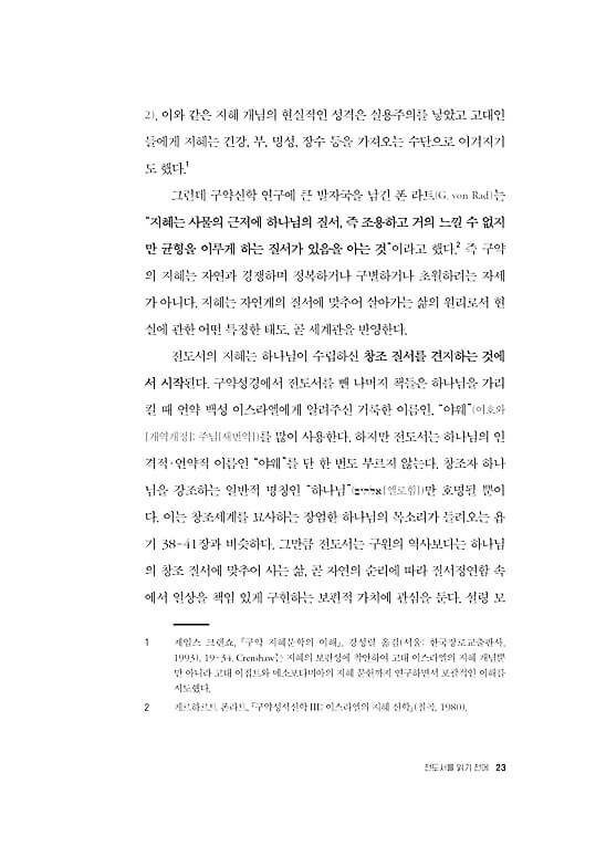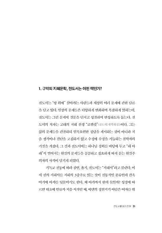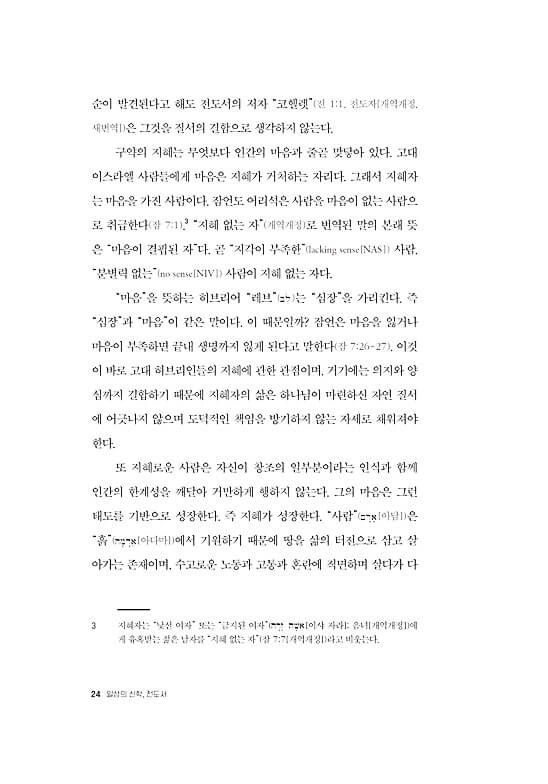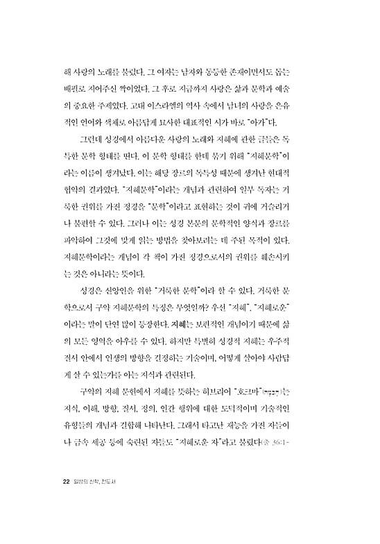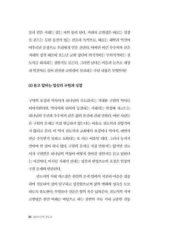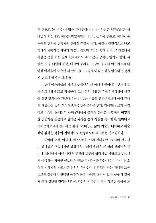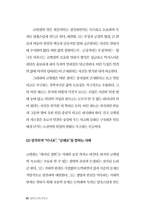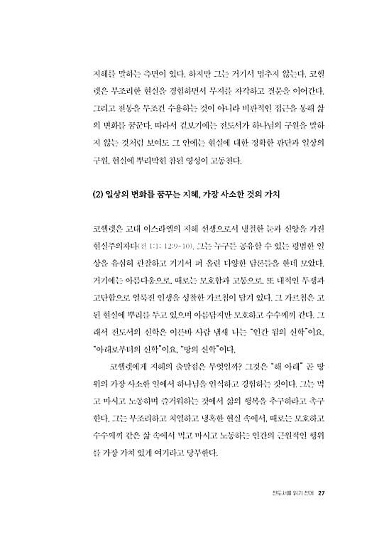 ● 전도서는 세상과 삶의 보편성과 예외성을 포괄하는 담론들을 제공하는 현실 해부의 현장성을 갖추었다. 우리는 전도서를 통해 숨겨진 실체의 이면을 발견하며 사물을 새롭게 보게 된다. 이로써 지혜 선생 코헬렛은 시간의 간극을 초월하여 지금 우리 시대에 영향력을 행사한다. 코헬렛은 마치 철학자처럼 우리에게 말을 걸어온다. 그는 익숙함을 잠시 제쳐 두고 당연함에 물음표를 던지며 일상의 세계, 곧 타인을 만나고 교신하는 “지금 여기”에서 마음의 밑자리를 성찰하도록 우리를 이끈다. _“전도서 읽기를 마치며”