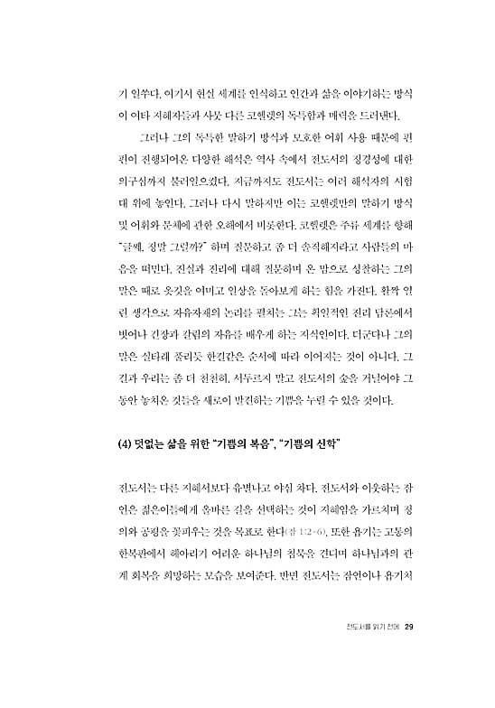 보통 전도서에 관한 그리스도인들의 이해는 단순하다. “세상의 모든 일이 헛되니 하나님을 경외하라”는 간략한 문장이 전도서를 요약한다고 생각하기 때문이다. 그 결과 우리 주변에서 전도서를 진지하게 다시 들여다보는 사람은 극히 드물다. 또한 교회 강단에서 전도서가 무게감을 가지고 설교 본문으로 사용되는 경우도 거의 없다. 한국교회가 다른 지혜서들과 마찬가지로 전도서를 매우 가볍게 취급하는 것이다.