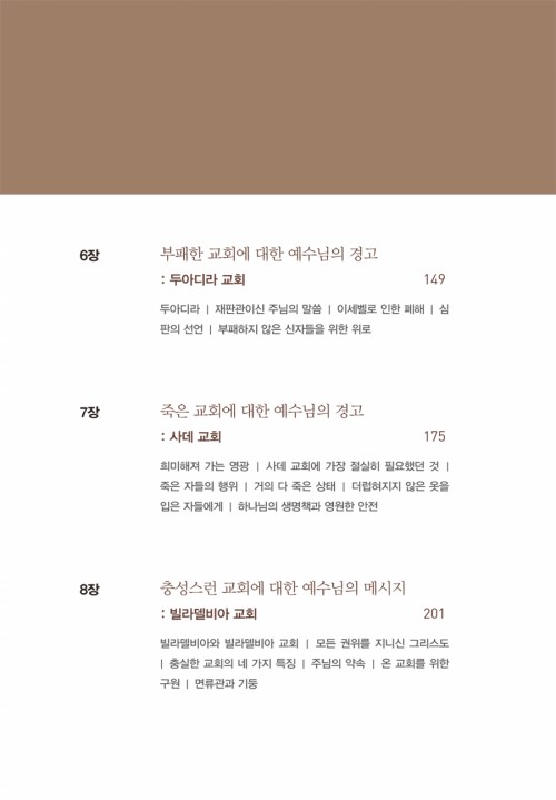 교회에서 예수님의 이름을 부르고, 그분을 찬양한다고 해서 하나님의 심판으로부터 안전할 수 있는 것은 아니다. 저자는 교회가 세상보다 더 안전한 것은 아니라고 강조한다. 물론 요한계시록의 편지들은 특별한 문제를 지니고 있던 소아시아의 특정한 교회들에게 보내진 것이지만, 그 내용은 역사상의 모든 교회에게 주어진 경고의 말씀으로 간주되어야 마땅하다. 특히 소아시아의 교회들에게 주어진 책망과 경고는 현대 교회들에게도 똑같이 적용된다.