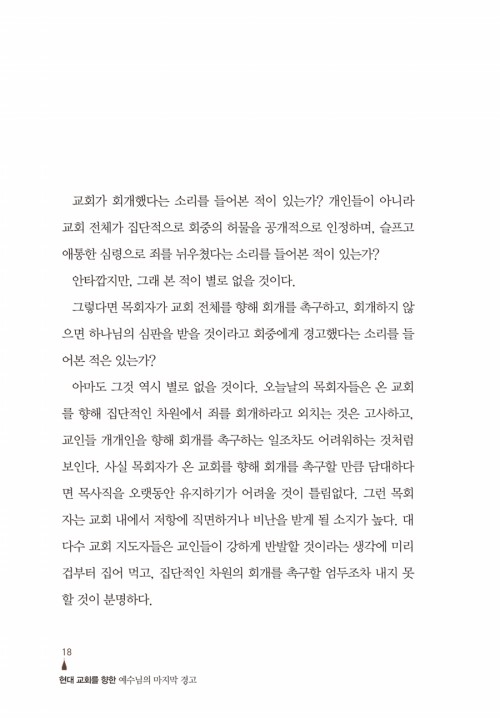 오늘날 세속화된 교회에 대한 비판이 뜨겁다. 하지만 책망과 경고와 회개의 메시지는 여전히 인기가 없다. 조금 용기를 내어 부패와 부도덕과 거짓 교리를 버리고 마음 깊은 곳에서 용서와 속죄와 회복을 외치면, “당신이나 잘하라”고 외면당하기 일수다.