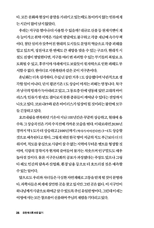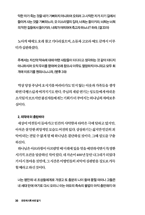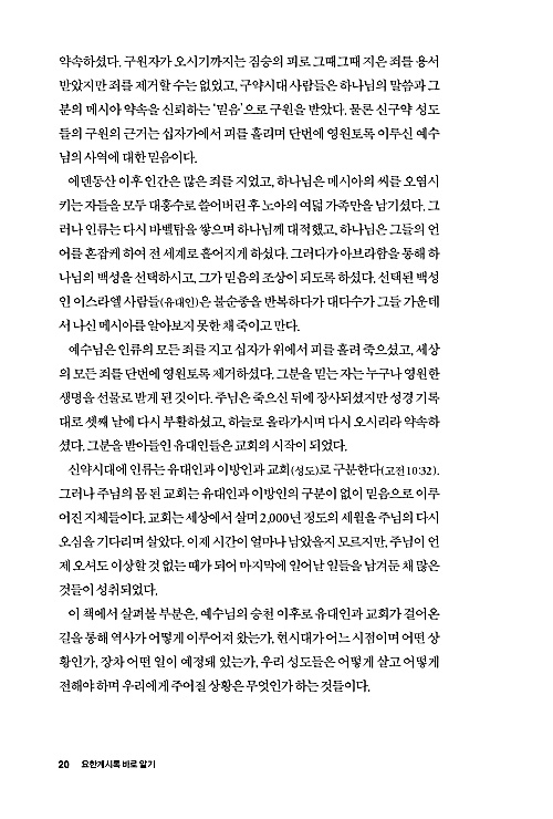 극단적인 시한부 종말론이나 막연한 두려움을 반복하는 해석의 악순환을 끊어내야 한다. 저자는 요한계시록을 건강하게 이해하고 바로 알게 하도록 책을 읽기 전에 알아야 할 예수님 재림의 시간표와 사건들부터 개념, 우리가 종말을 알아야 하는 이유와 요한계시록에 대한 태도와 방법까지 백신을 맞추듯 준비를 철저하게 시킨다.
