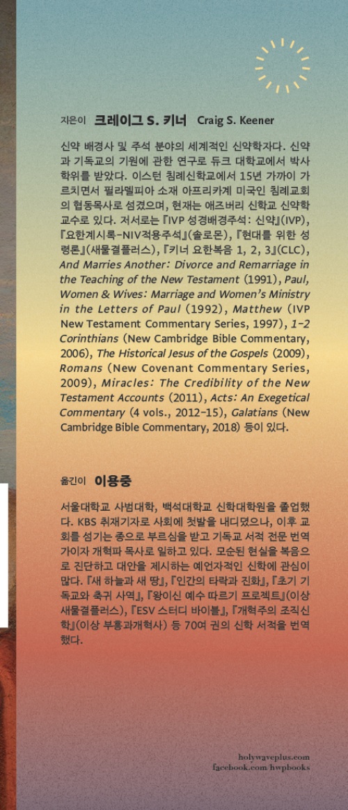 고대부터 현대에 이르는 방대한 관련 연구 자료를 “근원부터 자세히 미루어 살핀” 저자 키너의 수고를 통해 오늘의 독자들은 본서 이곳저곳에서 자신들이 미처 깨닫지 못한 유익을 얻게 될 것이다. 저자가 “이 모든 일을” 누가의 심정으로 쓴 것이 분명하다.