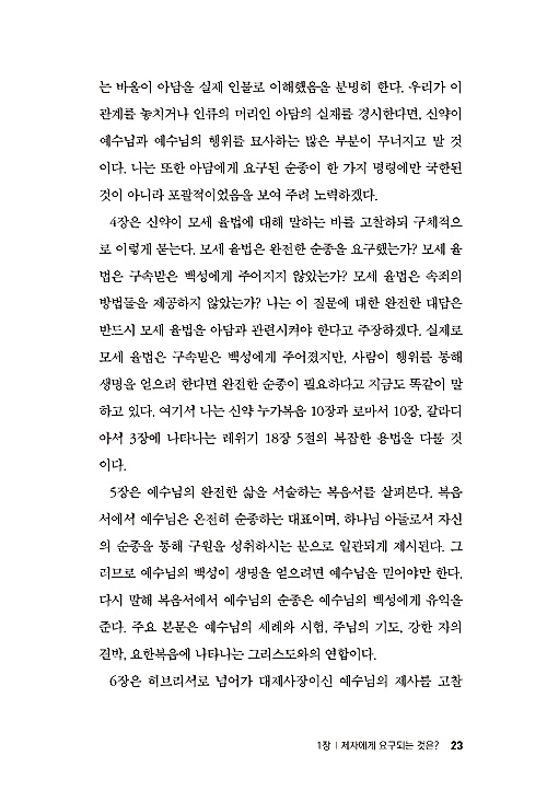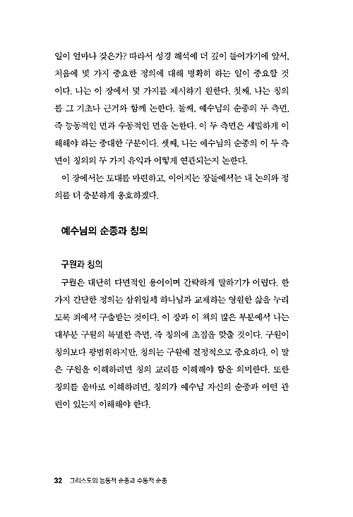 이 해석은 새로운 것이 아니지만, 종종 오해와 도전을 받아 왔다. 나는 이 견해를 분명하게 표명하고 새로운 시각에 대해서도 논하기를 바란다. 나는 약 15년 동안 이 책이 다루는 주제를 여러 방식으로 다루어 왔다. 그런데 더 많은 독자를 위해 그런 노력의 결실 가운데 많은 부분을 통합적이며 지속적인 논의로 새롭게 묶어 내는 것이 적합하다는 생각이 들었다. 나는 예수님의 순종이 신약신학의 핵심이며, 구속에 대한 성경 가르침의 핵심이라고 확신한다. 가독성과 이해도를 극대화하기 위해 이 책에서는 각주 수를 줄이려 최대한 노력했다. 그렇지만 특유의 방식으로 논점을 표현하는 어떤 저자를 따르는 경우나 당면한 문제를 어떤 저자가 특별히 명료하고 정확하게 포착한 경우에는 참고문헌(때로는 인용문도)을 포함시켰다. 때로 우리는 오래된 목소리들이 밝히는 생각도 들어야 한다.