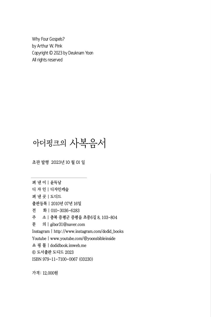 제가 앤드류 쥬크(Andrew Jukes)가 복음서에 관해 쓴 책을 처음 읽은 지 이제 12년이 넘었습니다. 그 책에서 저자는 네 명의 복음 전도자가 주 예수 그리스도에 대하여 제시하는 다양한 인물의 특징들을 아주 능숙하게 설명했습니다. 그 이후로 필자는 점점 더 큰 기쁨을 안고 계속해서 각 복음서에 대한 고유한 다양한 특징을 찾아냈습니다. 영국과 이 나라에 있는 여러 사람들에게 복음서의 목적, 디자인과 범위에 관한 일련의 성경 읽기를 제공하는 것은 필자의 특권이었습니다. 그리고 많은 분들이 책으로 출판해 달라는 요청을 하셨습니다.