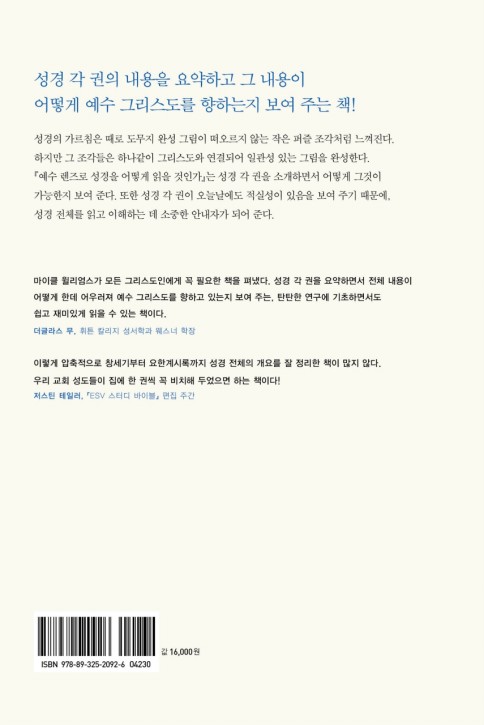 윌리엄스는 성경 66권을 한 권씩 능수능란하게 다루면서 그리스도를 이 이야기의 절정으로 보게 해주는 매력적인 방법을 제안한다. 각 장 중간에 있는 ‘예수 렌즈’라는 단락에서 성경의 모든 책이 그리스도의 중심성에 어떻게 기여하는지 주목하고, 그다음에는 그 메시지가 현대를 사는 우리에게 어떤 의미인지 친절히 풀어 준다.