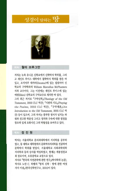 인 원천이었으며, 언약 백성의 소망이 어려 있는 장소였다. 월터 브루그만은 성경 말씀, 이스라엘의 주요한 전승을 통하여 땅의 주제를