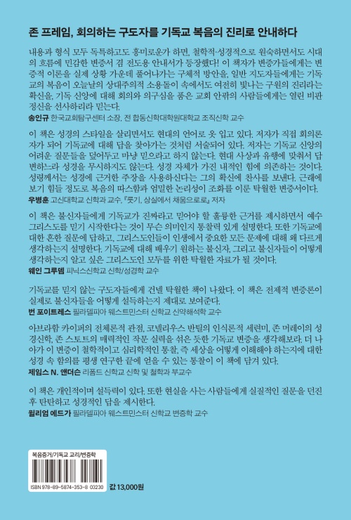 내용과 형식 모두 독특하고도 흥미로운가 하면, 철학적·성경적으로 원숙하면서도 시대의 흐름에 민감한 변증서 겸 전도용 안내서가 등장했다! 이 책자가 변증가들에게는 변증적 이론을 실제 상황 가운데 풀어나가는 구체적 방안을, 일반 지도자들에게는 기독교의 복음이 오늘날의 상대주의적 소용돌이 속에서도 여전히 빛나는 구원의 진리라는 확신을, 기독 신앙에 대해 회의와 의구심을 품은 교회 안팎의 사람들에게는 열린 비판 정신을 선사하리라 믿는다.
