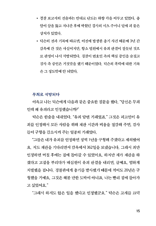 마침내 일 년 후 법정에서 딕슨은 15년 된 베테랑 경찰관에게 총을 쏜 죄를 공식적으로 인정했다. 그때 〈시카고 트리뷴〉의 기자인 나도 그곳에 앉아서 메모를 하고 있었다. 앞서 제시한 모든 증거에다 덧붙여진 자백 때문에 그 사건은 그렇게 결말이 났다. 판사는 딕슨에게 구금 명령을 내리고 난 후 그 사건이 종결되었음을 알리기 위해 의사봉을 두드렸다. 드디어 정의가 온전히 실현되었다.