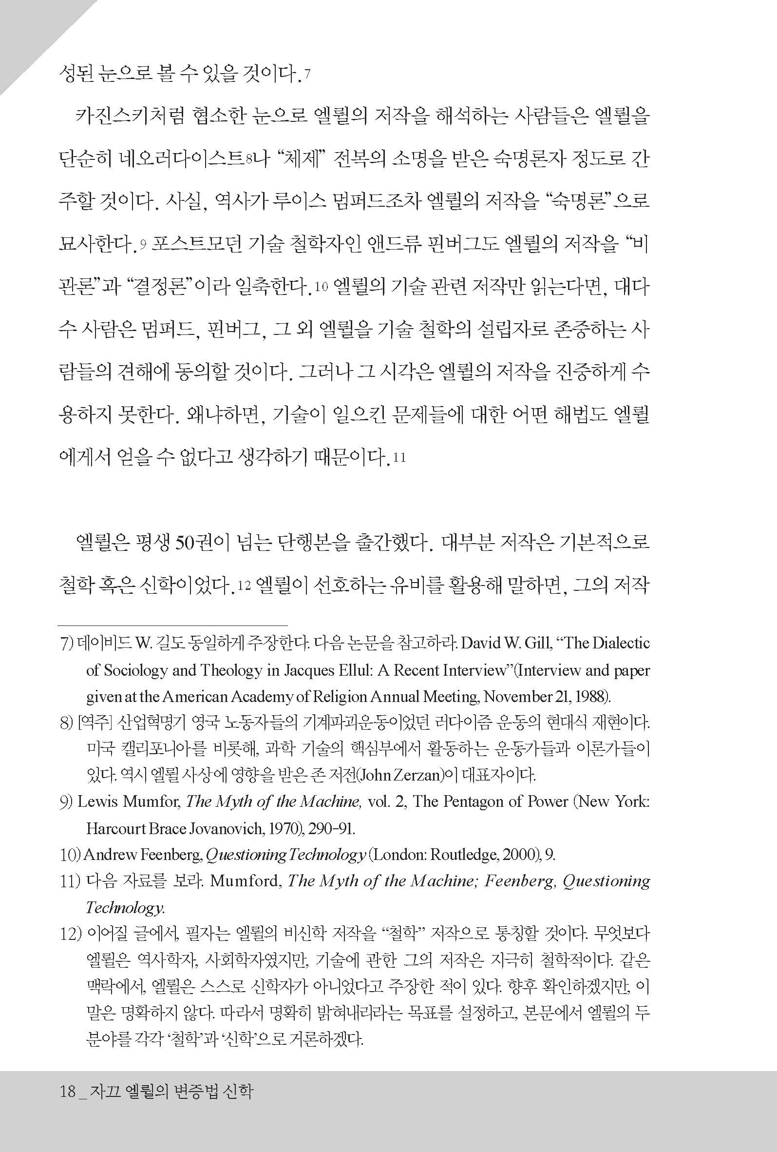 우리는 엘륄의 신학적 토대에 주목하지 않은 채 그의 사상에 들어갈 수 없다. 저자는 엘륄 저작에 대한 오독의 원천을 거기에서 발견한다. 저자는 예리한 분석을 통해 엘륄 저작의 신학적 구조를 상세히 설명하며 엘륄의 저작을 올바로 이해하는 데 있어 신학이 수행하는 중요한 역할을 제시한다. 이 책은 자끄 엘륄의 주요 사상을 소개하고, 신학과 철학 분야에 대한 엘륄의 공헌을 짚으며, 기술철학이 신학과 문화에 어떻게 연관되는지를 탐구한다.