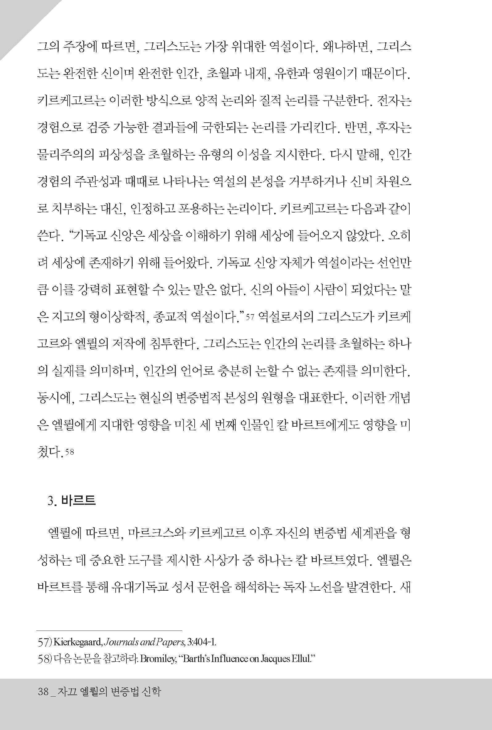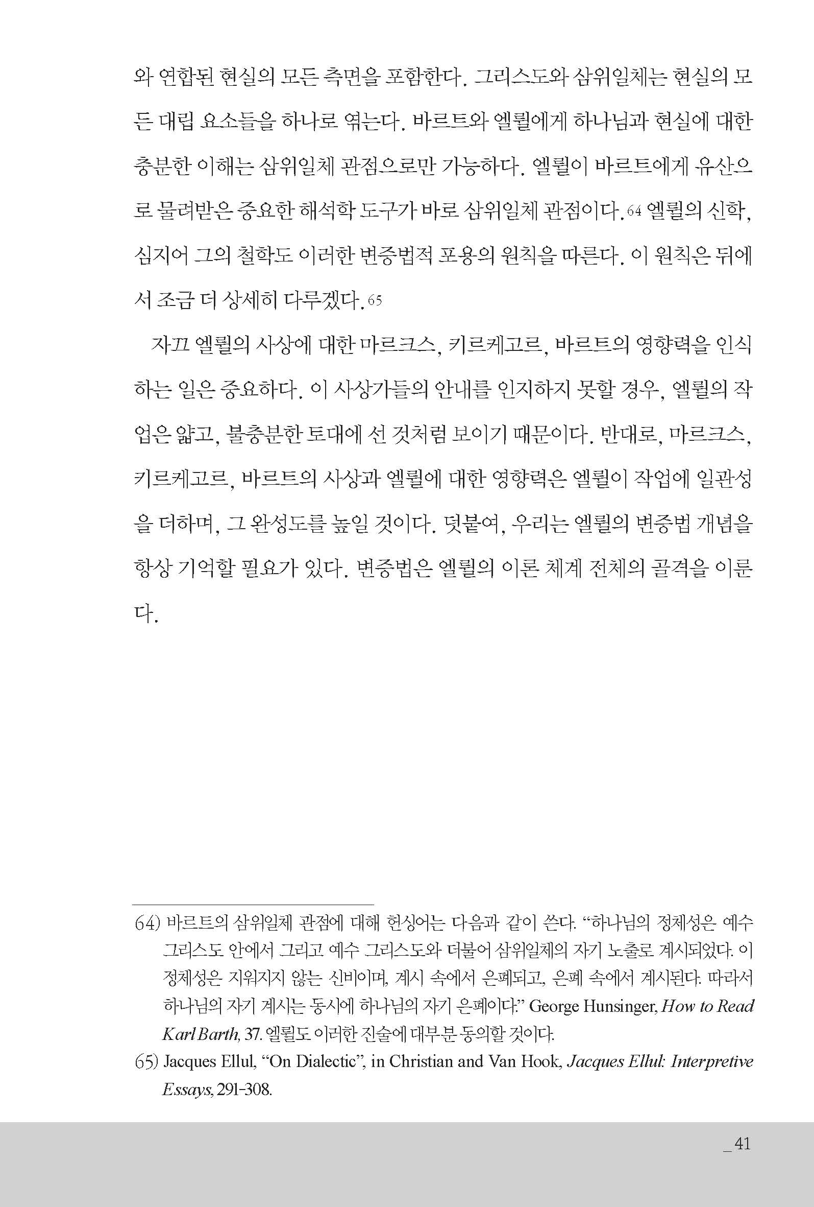 “프랑스의 사회 평론가 자끄 엘륄은 다층적인 변증법을 구사한 사상가이다. 오늘날 기술에 미쳐 살아간다고 해도 과언이 아닌 현대인의 삶에 통찰력과 명민함을 갖춘 그의 목소리가 쩌렁쩌렁 울리지 않는 데에는 우리 엘륄 연구자의 책임이 적지 않다. 저자는 이 점을 뼈아프게 지적한다. 영국과 미국식 합리주의에 젖어 사태를 직선적이고 일원론적으로 사유하려는 사람들은 엘륄과 같은 변증법 사상 앞에서 길을 잃거나 사상의 모양새를 이해하지 못한다. 밴 블리트는 이 책을 통해, 50여 권에 달하는 엘륄의 방대한 저작에서 신학과 사회학, 개인과 집단, 자유와 필연, 현실과 진리, 예와 아니오, 죄와 거룩함 사이에 맴도는 변증법적 긴장과 간극을 이해하고 평가하는 데 유용한 시각을 제시한다. 그는 엘륄 연구를 통해 모든 인간, 모든 현상 내부에서 작동하는 변증법의 원리를 밝힌다. 밴 블리트의 글을 읽고, 마치 어두운 방의 그늘이 걷히고 새로운 언어로 살아있는 소통을 하는 것과 같은 인상을 받았다.”