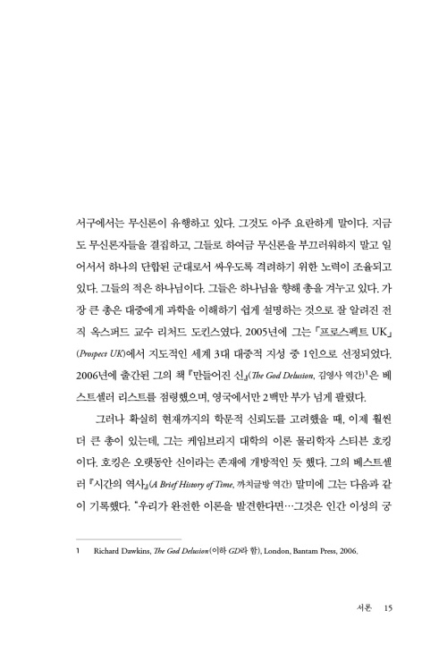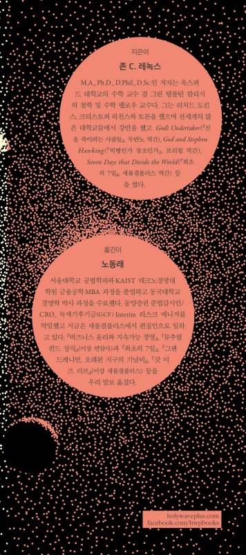 존 레녹스는 이 책에서 도킨스뿐만 아니라 호킹, 데닛, 히친스와 같은 신무신론자의 주장을 분석적으로 읽으면서 신앙은 근거가 없는 상상의 세계요, 과학은 근거를 가진 객관적 사실이라는 편견을 주의 깊게 논박하면서 신앙 역시 그 자체의 탄탄한 논리적 근거를 가진 설득력 있는 체계이며, 과학도 신뢰라는 주관적 차원을 갖는 철학의 영역에서 배제되지 않는다는 것을 설득력 있게 드러낸다. 다양한 견해들이 경쟁하는 다원주의 시대를 살아가면서 직면하게 되는 우리 시대의 질문을 외면하지 않는 목회자, 신학생, 그리고 크리스천 지성인들에게 이 책의 일독을 권하는 바이다.