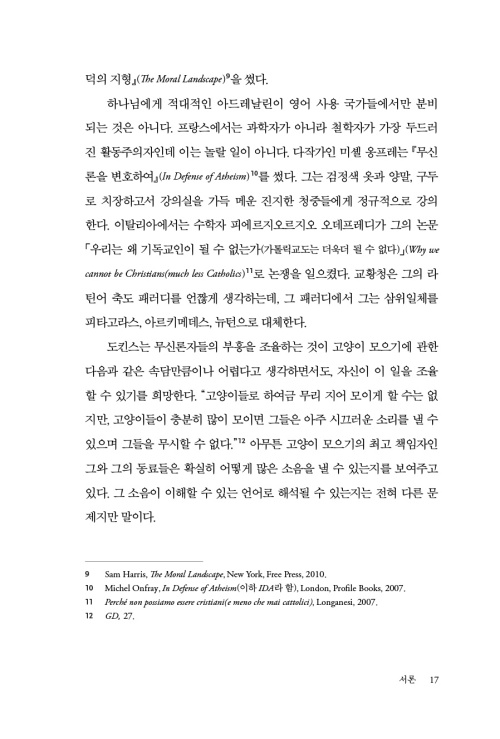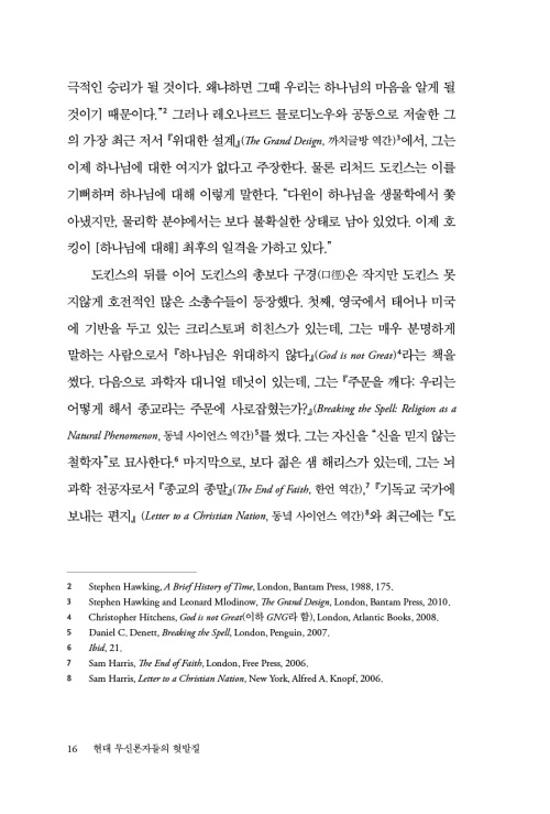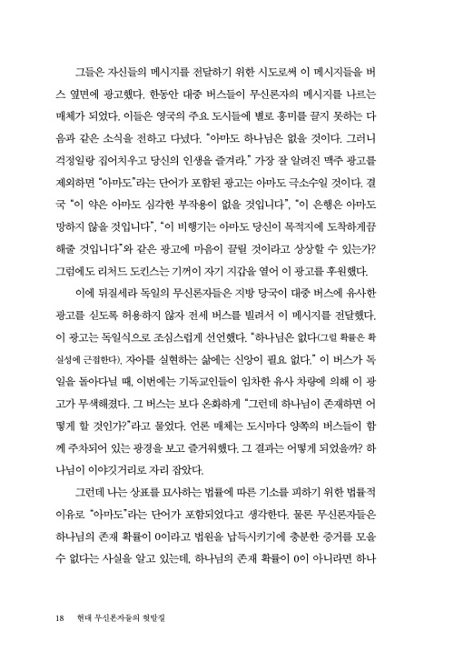 구 무신론자들이 '신의 존재'를 허상으로 규정하고 비판했다면, 현대의 신 무신론자들은 아예 '종교의 필요성'을 부정한다. 이러한 현대 무신론자들에는 저명한 과학자인 리처드 도킨스와 대니얼 데닛 같은 과학자를 비롯하여 샘 해리스, 크리스토퍼 히친스 등이 포진해 있다. 이들은 다양한 저술과 수많은 강연 등을 통해서 오늘날 종교가 인류에 끼치는 '해악'들을 강렬한 언어를 동원하여 열심히 '전도'한다. 그들에 따르면 종교는 한마디로 철 지난 미신 혹은 맹신에 지나지 않으며, 따라서 매우 비이성적이며, 결과적으로 수많은 폭력을 양산하는 사회악에 불과하다. 확실히 우리는 지금도 세계 도처에서 벌어지는 종교간 분쟁, 종교로 인해 빚어지는 정치-사회적 갈등, 종교의 이름으로 자행되는 비이성적인 행동을 접할 때마다 이들의 주장에 절로 고개를 끄덕이게 된다. 하지만 그들이 과학과 이성의 이름으로 수행하는 종교 비판, 특별히 기독교에 대한 비판은 과연 얼마나 정확하고 또 공정한 것인가? 더 나아가 진짜로 종교가 사라지기만 하면 과연 이 세상은 지금보다 훨씬 더 살만한 곳이 될 것인가?