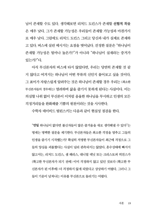 본서는 기독교 신앙의 합리성을 과학적으로 품위 있게 논증하는 명저다. 수학자인 저자는 도킨스 등 현대 무신론자들이 맹목적 신앙의 공리에 기초하여 기독교 신앙의 본질과 부활 등 다양한 주제들을 대하는 교묘한 태도를 집요하게 분석하면서 이 들의 주장이 지닌 자가당착인 논리적 모순을 통쾌하게 들추어낸다. 본서가 한국 기독교의 변증 수준을 한층 더 진전시키리라 기대한다.
