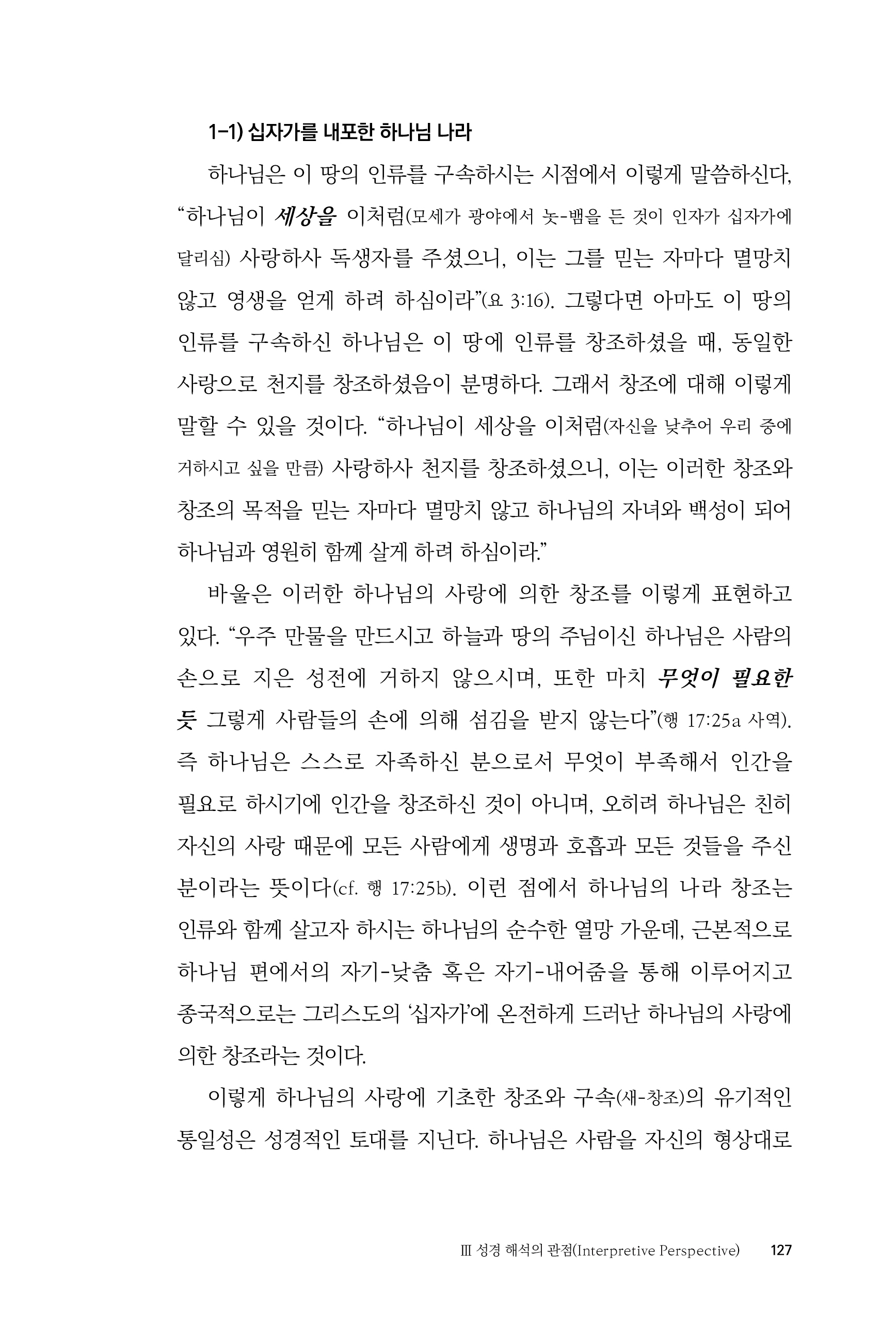 이 책은 분명히 전문적인 신학 내용을 다루는 학술서이다. 그러나 깊이 있는 성경 연구를 통해 이 성경을 믿고 살아간다는 것이 진정 어떤 의미인지를 밝혀내고, 독자로 하여금 그 삶의 패턴을 따라 살아가도록 이끈다는 의미에서 실천적인 책이기도 하다. 부디 많은 독자들이 이 책을 통해 내세 지향적인 이원론적 신앙에서 벗어나 현실에서 분투하며 살아가는 참된 기독교인의 삶으로 돌아오기를 기대한다.