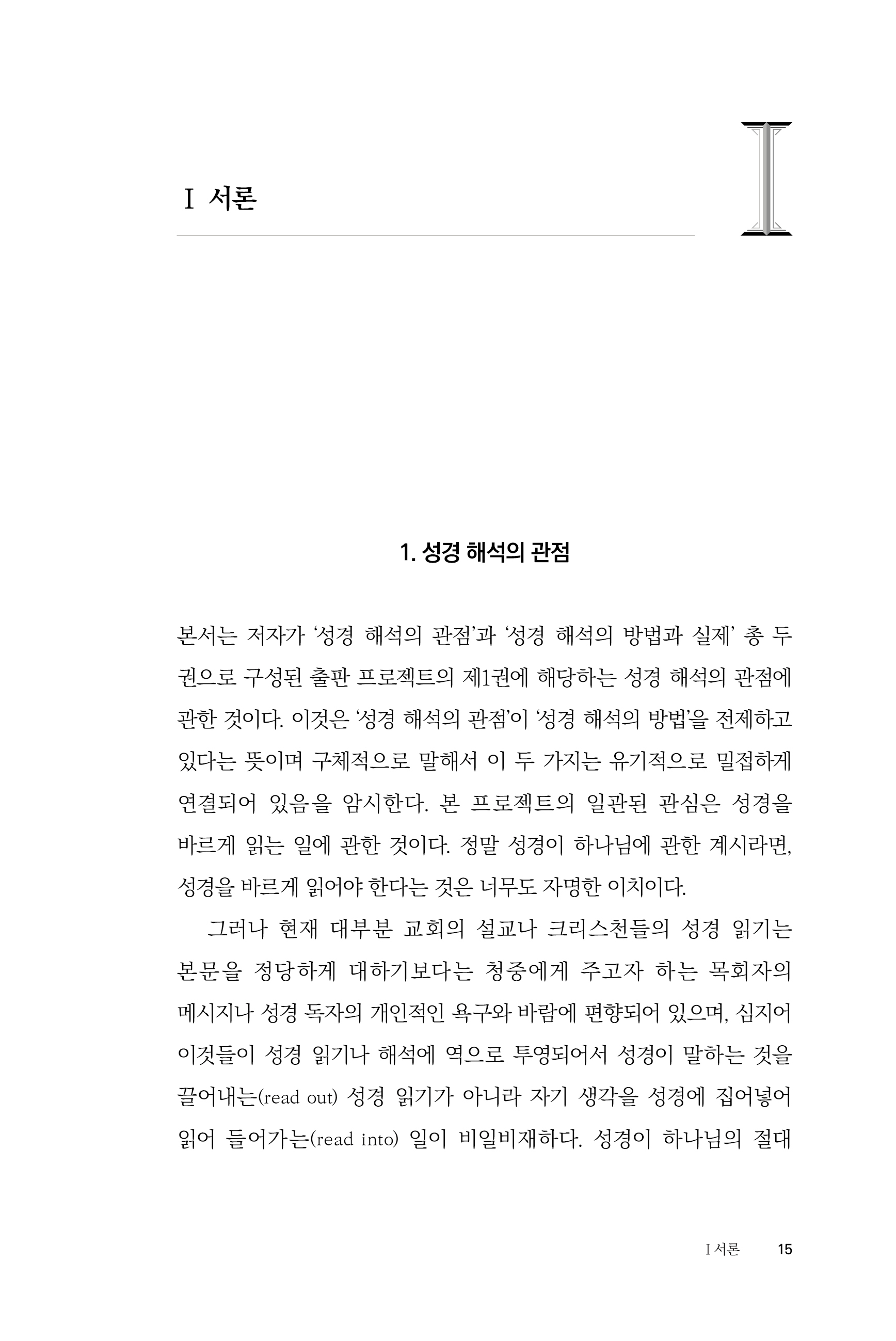 이 맥락에서 성경을 바르게 읽으려면 두 가지가 꼭 필요하다. 하나는 성경을 바라보는 바른 관점 혹은 창이 열려야 한다. 이것은 성경해석/읽기의 관점에 관한 것이다. 또 하나는 성경을 읽는 법, 즉 성경 해석의 방법에 관한 것이다. 사실 이 둘 사이의 관계나 우선순위의 문제는 명쾌하게 답하기 어렵다. 오랫동안 성경을 해석하고 성경해석을 가르쳐 왔지만, 여전히 이 문제는 답하기 어렵다. 달리 말해서 먼저 성경 해석의 관점이 형성되고 나면 그 관점에서 성경을 바르게 해석할 수 있는 것인지, 아니면 성경을 바르게 해석하는 일이 오랜 시간에 걸쳐서 축적되어 그 결과물로 성경 해석의 관점이 형성되는지를 말하기가 쉽지 않다는 뜻이다. 아마도 답은 이 둘 사이의 관계는 상호적이라는 것이다. 해석은 관점을 형성하는데 도움을 주고, 관점은 해석이 이루어지는 과정에 중요한 인도자 혹은 운전자 같은 역할을 한다는 뜻이다. _ 1장. 서론
