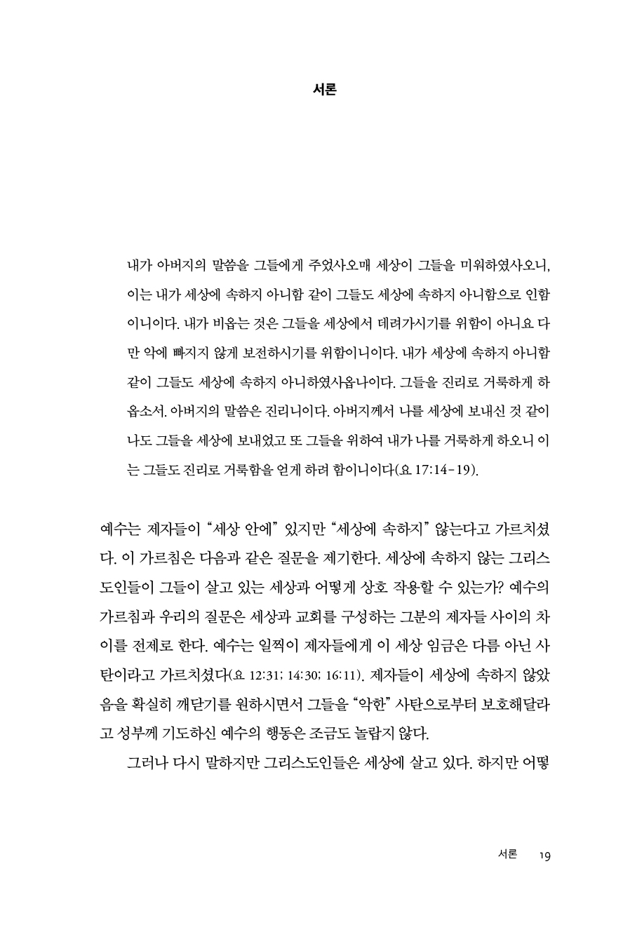 저자가 누누이 강조하듯이 성경은 오늘날의 특정한 공공 정책을 제시하지 않는다. 다만 그 원칙을 제시할 뿐이다. 저자는 성서학자답게 특정 주제와 관련된 성경 본문을 철저히 분석하면서 성경적 원칙을 천명하고 있다. 저자가 다루는 여러 항목 중 각자 관심이 가는 주제가 있을 것이다. 어느 민족보다 성경을 많이 사랑하고 열심히 읽는 한국 그리스도인들이 이 책을 참고하여 성경을 읽고 세상을 바라본다면 쟁점이 되는 여러 사회 문제에 관해 올바른 성경적 지침을 찾고 적용할 수 있을 것이다.