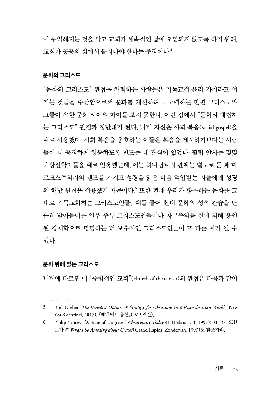 개인적으로는 기독교와 문화 사이의 상호 작용에 대해 단일 전략이나 공식은 없지만 “뱀처럼 지혜롭고 비둘기처럼 순결하라”는 예수의 지시가 그리스도인들이 공공 생활에서 일어나는 특정 문제들에 반응할 때 지혜를 활용하라는 권고라고 생각한다. 다시 말해 모든 상황에 두루 적용되는 접근 방식은 없다. 우리는 때에 따라 물러서거나 적극적으로 개입하고 주장하기도 하며, 문화를 변혁하고 인간화하라는 요구를 받는다.