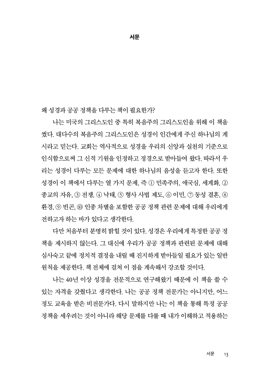 성경은 우리에게 특정한 공공 정책을 제시하지 않는다. 그 대신에 우리가 공공 정책과 관련된 문제에 대해 심사숙고 끝에 정치적 결정을 내릴 때 진지하게 받아들일 필요가 있는 일반 원칙을 제공한다. 책 전체에 걸쳐 이 점을 계속해서 강조할 것이다.