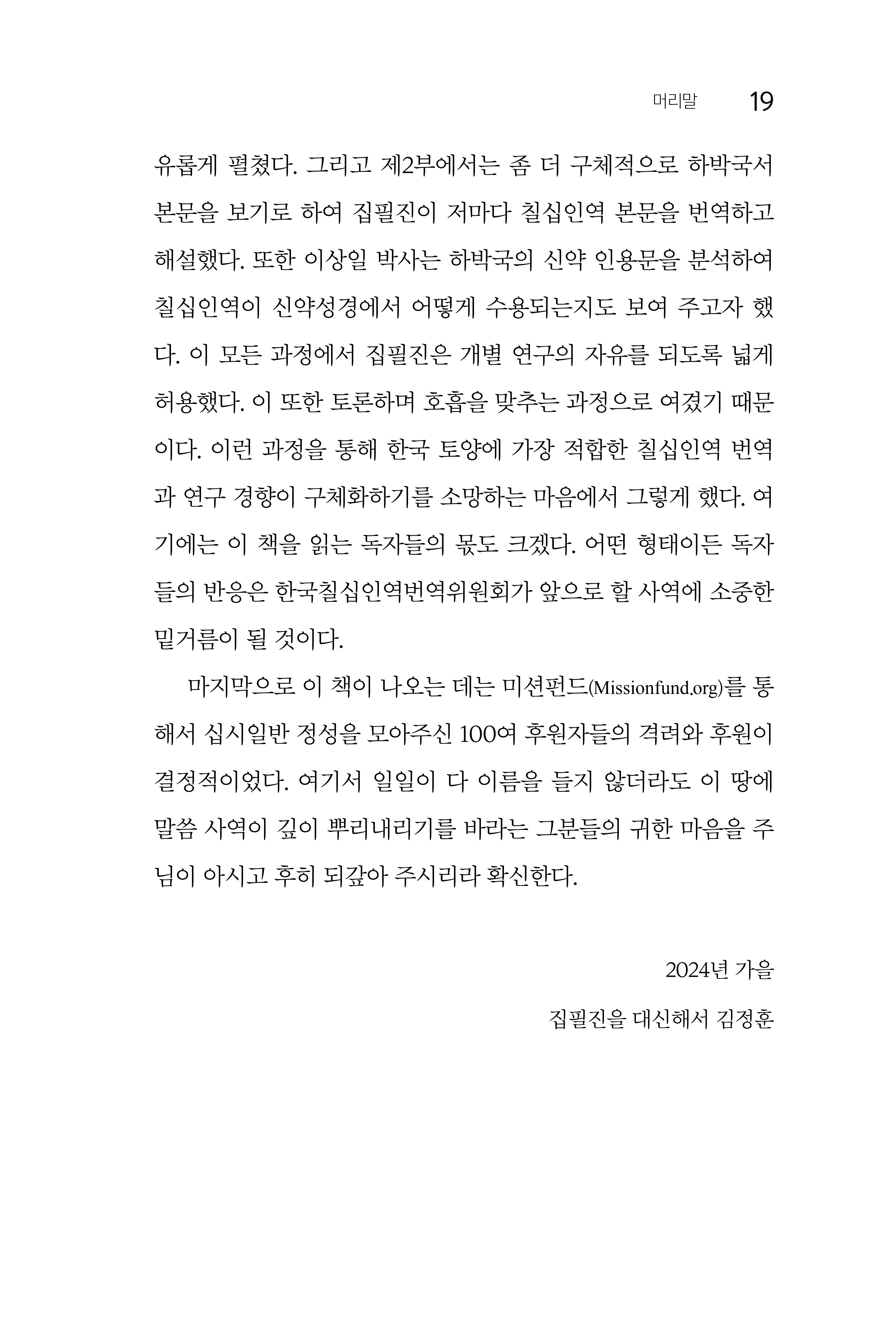 한국칠십인역번역위원회는 이 책을 시작으로 해서 앞으로 칠십인역 우리말 번역본을 본격적으로 내놓을 것이다.