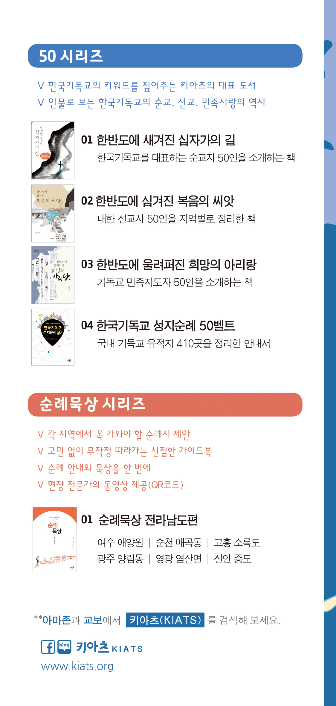 나무 한 그루, 풀 한 포기 제대로 자라지 못하는 척박한 조국 땅에 뿌려진 복음의 씨앗은 싹이 트고 자라나서, 새들이 깃들일 만한 큰 나무의 군락지가 되었습니다. 《한국기독교 성지순례 50》은 그런 의미 있는 곳들을 찾는 순례자들을 위한 안내도가 되기에 충분하다고 믿습니다. 주님의 발자취를 신실하게 걸었던 이들을 찾아보면서 우리도 그들의 믿음을 본받는 자들이 되길 소원해 봅니다.
