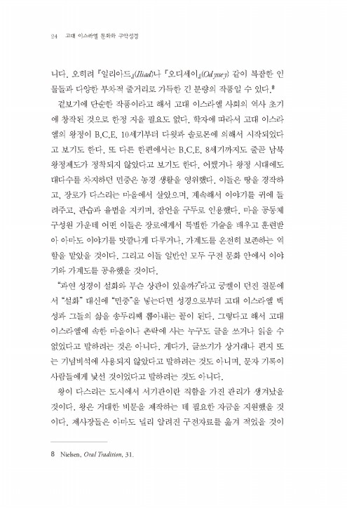 본서는 구약성경 형성에 관한 기존의 특정한 이론을 지지하지도 부정 하지도 않으면서, 구약성경 내에 존재하는 문자 문화와 구전 문화 사이의 역동적 상호작용을 설명한다. 니디치 박사가 구전 문화의 관점에서 새롭게 해석한 성경 구절들과 만나는 것도 본서의 재미이다. 구약성경 문학의 형성과정에 관심있는 모든 사람에게 본서를 추천한다.